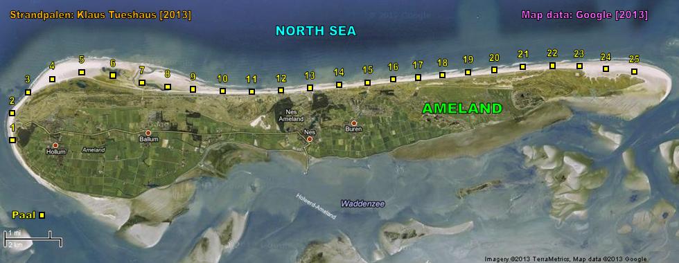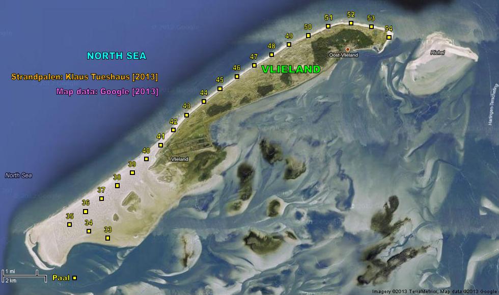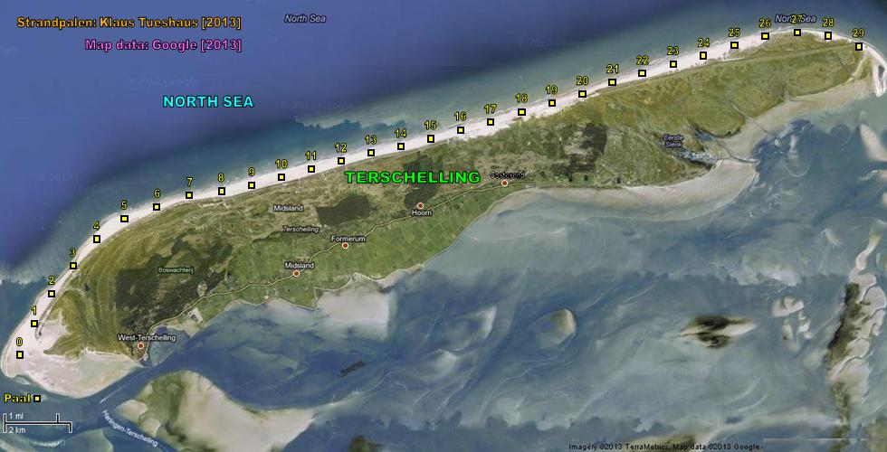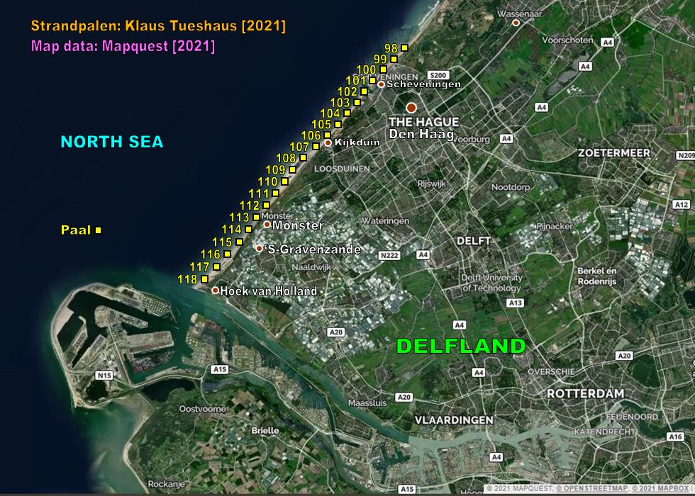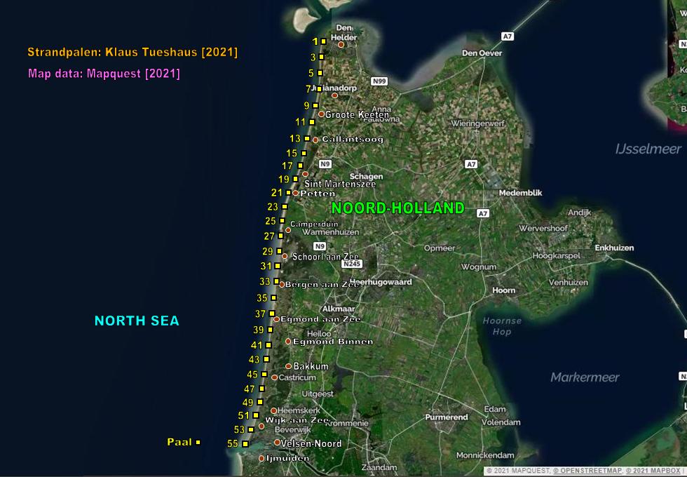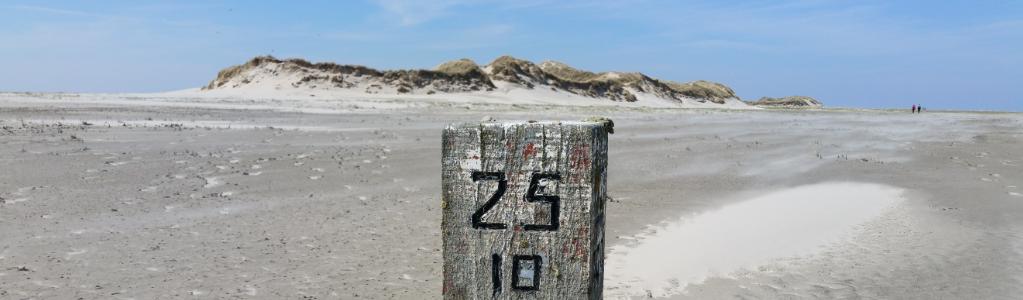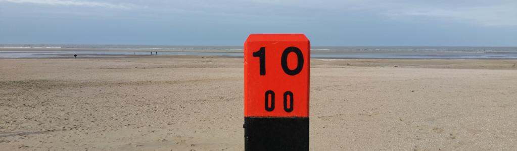 The North Sea Coast of The Netherlands is in its full lengths completely marked with beach posts (dutch: Strandpalen). The poles are mostly positioned on the beach. The maximum distance between two poles is 1000 m. The numbers on the poles are kilometer markers.