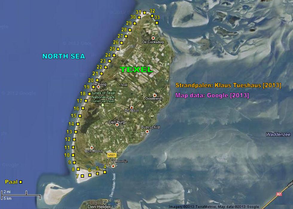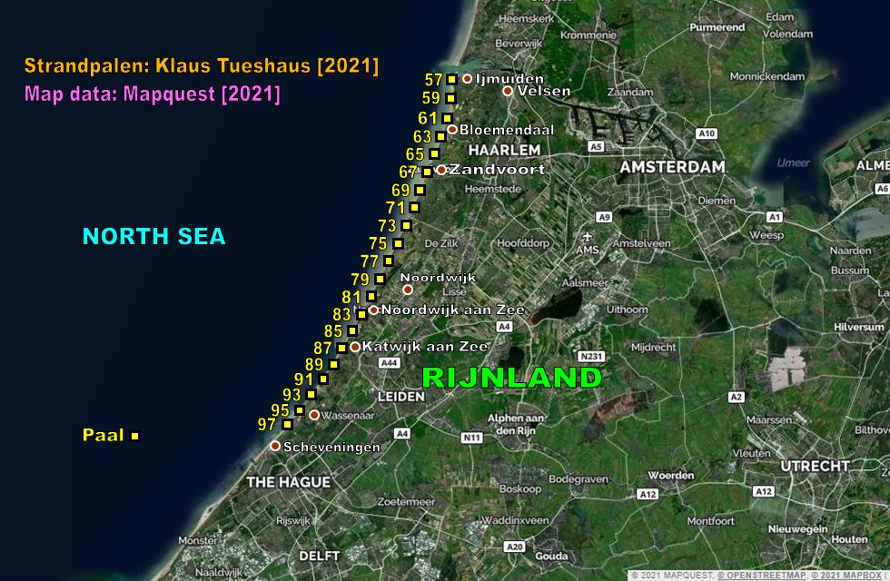 De hele nederlandse noordzee kust is voorzien van strandpalen. Deze palen bevinden zich voornamelijk op de strand en hebben een afstand van maximaal 1000 m van paal tot paal. Op de palen is een nummerbord aanvezig met gegevens van de kilometer of de paal.
